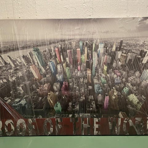 Stor canvastavla med motiv av New Yorks skyline i färgade toner. Tavlan har en tjock ram och är uppspänd på träram. Färgerna inkluderar svart, vitt och flera färgade byggnader. Tavlan är avsedd för väggupphängning och har en modern stadsbild som motiv.