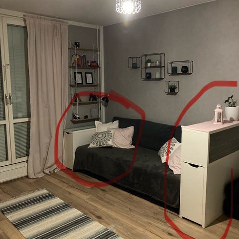 IKEA FLAXA vit och grön sänggavel med hyllor och utdragbart förvaringsutrymme. Fint skick!