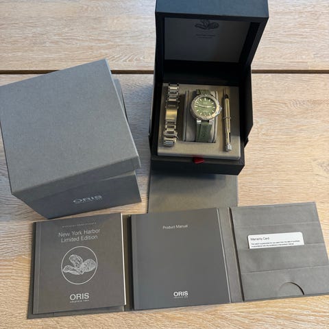 Klockan är i gott skick och kommer med både gummiband och länk, båda orginal från Oris.