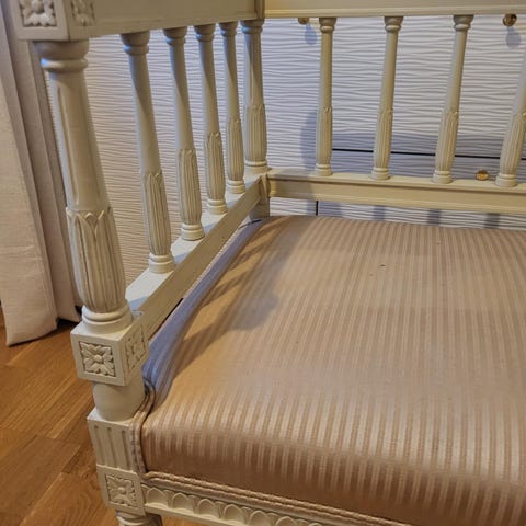 Liten soffa i gustaviansk stil. Fläckar på tyget.