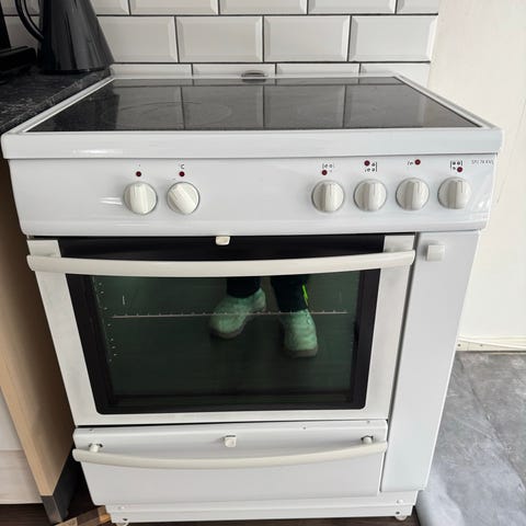 Cylinda glaskeramikspis med fyra kokzoner och ugn. Vit färg med vred för inställning av värme och funktioner. Ugnen har ugnsgaller och plåt. Spisen är avsedd för hushållsbruk.