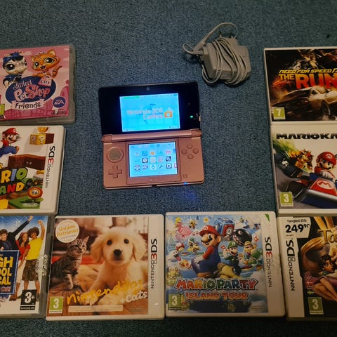 Nintendo 3DS handhållen spelkonsol i blå färg. Konsolen har dubbla skärmar med den nedre som är pekskärm. Designad för bärbar spelanvändning.