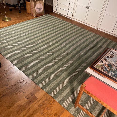 Ett par handvävda rölakaner i ull, Skåne/Halland, sent 1700-tal-tidigt 1800-tal (enl. ChattGPT). Den större mattan med invävda initialer ”FAF”.