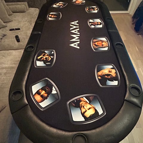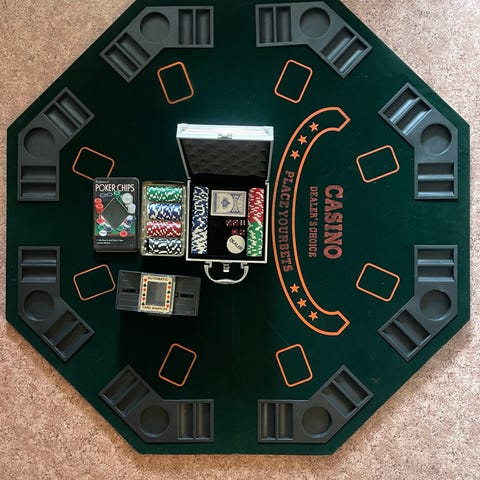 Ett pokerbord med plats för 8 personer att spela på . Chiplåda med markör . 2 st extralådor med chip . Vissa utav chiphållarna på bordet är lösa , men är enkelt fix med lite lim …