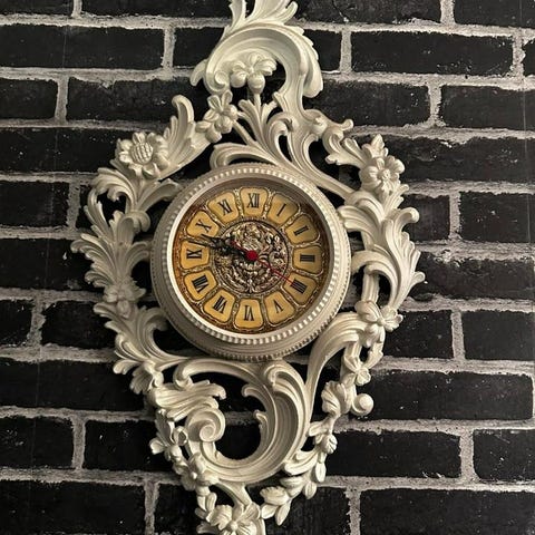 Antik väggklocka tillverkad i trä med glasframstycke och pendel. Klockan har en rund urtavla med romerska siffror och klassisk design. Passar för väggmontering och tidvisning i hem eller kontor.