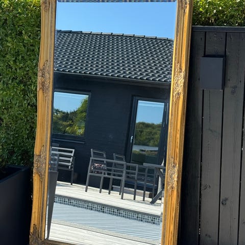 Stor spegel med en ram som gör den till en bra inredningsdetalj
