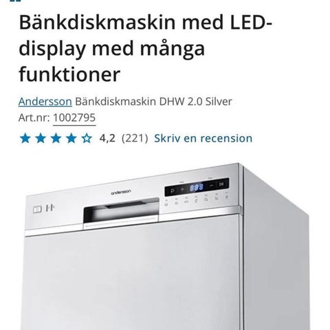Fin bänkdiskmaskin från märket Andersson. Komplett med bestickkorg. Fungerat lika bra som våran stora ”riktiga” diskmaskin. Riktigt smidig med flera olika program såsom Eco och ömtålig diskning av glas. Inköpt omkring 2022. Pris ny 2990 kr. Mitt pris 1000 kr. Hör av er vid frågor!
