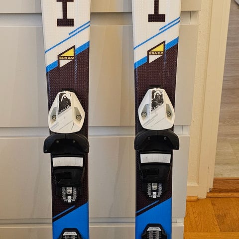 Skidor med passande pjäxor. Skidorna är 110 cm