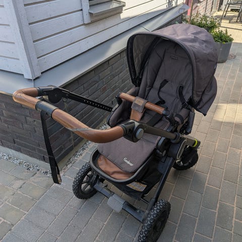 Emmaljunga barnvagn i mörkblå med bruna detaljer. Barnvagnen har en mjuk och vadderad insida i ljus färg och är utrustad med en justerbar sufflett. Handtag och bygel är klädda i brunt läderliknande material. Vagnen har stora hjul för stabilitet och komfort vid körning.