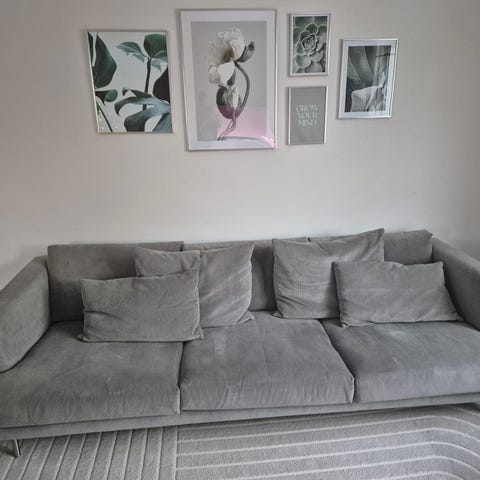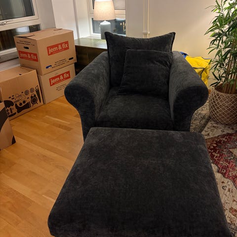 Harper 3-sits med schäslong från Mio i mycket fint skick. Klädseln är i tvättbart tyg, vilket gör den praktisk och lätt att hålla fräsch. Soffan är väl omhändertagen och kommer från ett rök- och djurfritt hem.