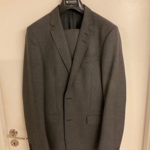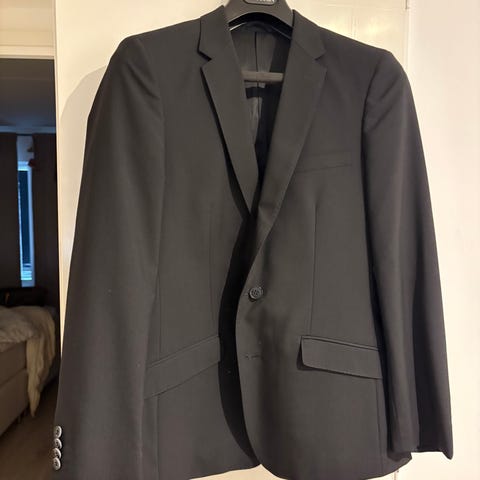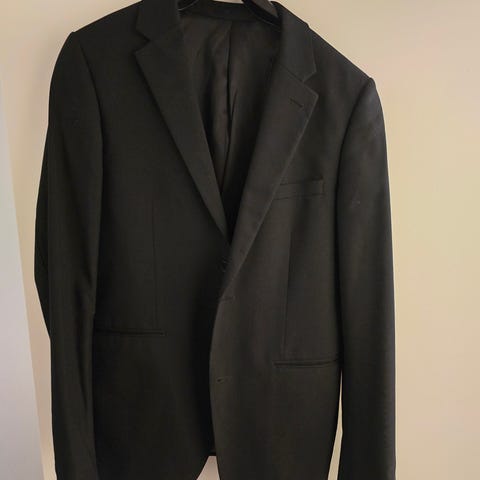 Hugo Boss kostym med väst i svart färg och med kritstreck i mild röd ton, storlek 150.