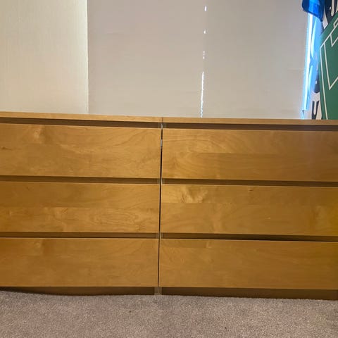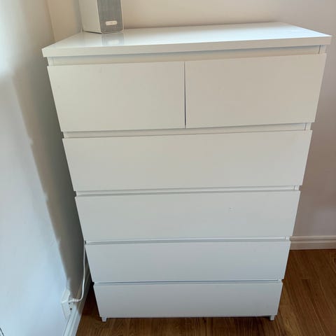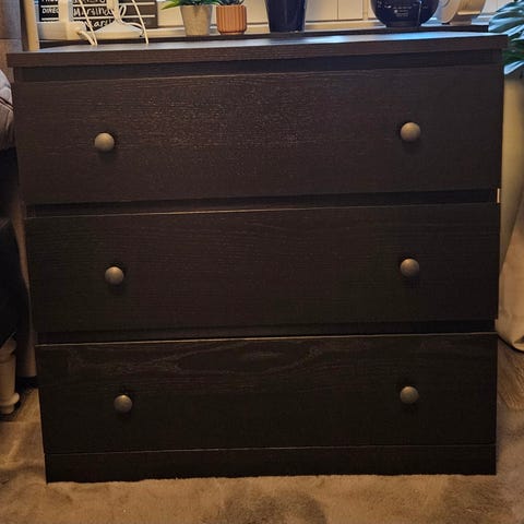 Säljer en elegant och praktisk MALM byrå från IKEA i ekfaner med fyra rymliga lådor. Den tidlösa designen passar lika bra i sovrum som hall eller vardagsrum. Byrån är i okej skick och har en varm träton som ger en naturlig och harmonisk känsla till rummet.