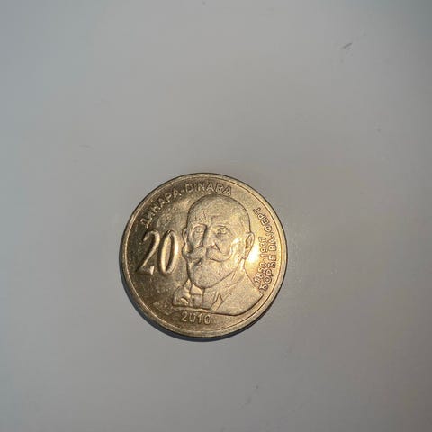 Jugoslavien 20 Dinara mynt från 2006. Myntet är tillverkat av metall och har en diameter som är typisk för valören. Det har inskriptioner och ett porträtt på ena sidan.