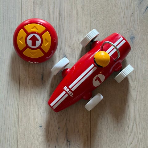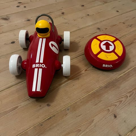 BRIO radiostyrd racerbil i röd färg med fjärrkontroll. Leksaken är utformad som en racerbil med detaljer som hjul och förarhjälm. Passar för barn och är avsedd för lek och motorisk utveckling. 2-4år