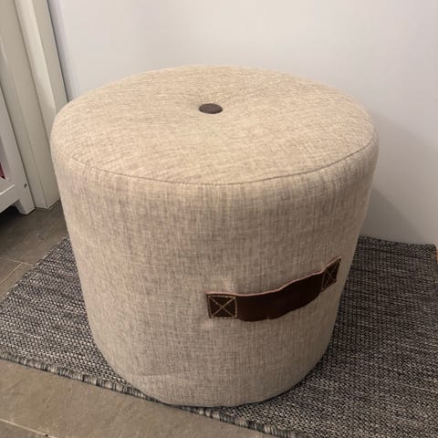 rund sittpuff med vackert lappmönster i orangea/röda färger! passar som extra sittplats , fotpall eller dekoration. Mjuk o bekväm. reva längst ner i tyget, men som enkelt kan sys tillbaka(se bild)