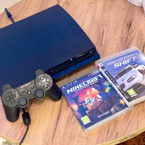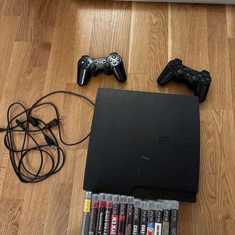 PS3 konsol. Har inga kontroller till men sladdarna i bild.