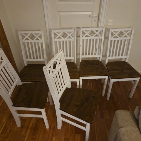 Stabila stolar som jag gärna hade behållit, men sambon vill annorlunda. Shabby chic stil med skav (syns på bilden).