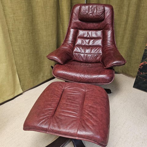 Fåtölj har ben stöd som man kan fälla upp och rygg stöd kan luta bak