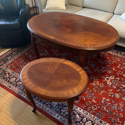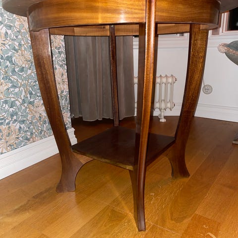 Runt bord tillverkat i trä med art deco stil. Integrerade ben och intarsia. Bordsskivan har en blank yta. Passar som matbord eller sidobord i vardagsrum eller matsal.