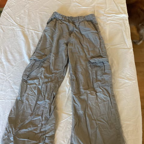 H&M byxor i beige färg, storlek XXS för dam. Tillverkade i bomullsmaterial. Byxorna har en elastisk midja med knappstängning och flera fickor. Passar för vardagligt bruk. Också är storleken 152, för både flickor och pojkar. Den är ganska skrynklig för den har legat i en påse men den går att stryka.