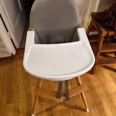 IKEA Barnstolar barnstol utrustad med en avtagbar bricka. Stolen är i vitt och har ett enkelt, funktionellt utförande anpassat för barn.