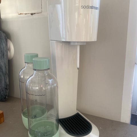 Sodastream kolsyremaskin i svart färg. Används för att kolsyra vatten och andra drycker hemma. Två flaskor medföljer. Finns för avhämtning i Sävedalen.