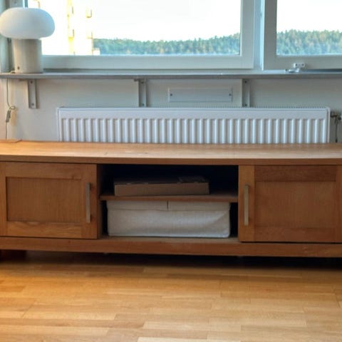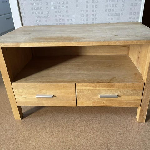 Tv bänk i ek, 2 st, avtagbara hyllplan, fungerande lådor, märken på översta skivan [på båda tv bänkarna], se bilder.
