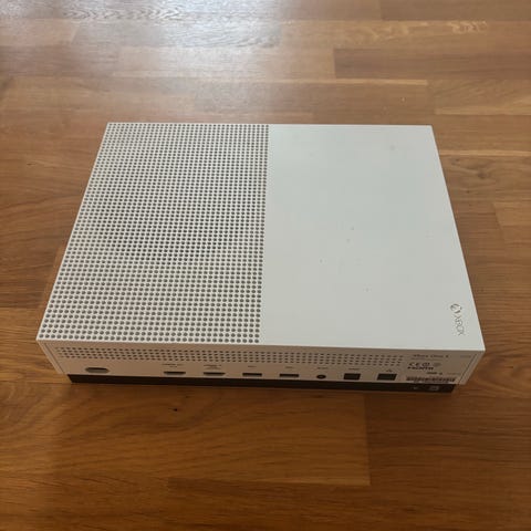 Xbox One S Digital Edution Spelkonsol i vit färg med tillhörande svart handkontroll. En spelkonsol för hemmabruk som erbjuder underhållning och spelmöjligheter.