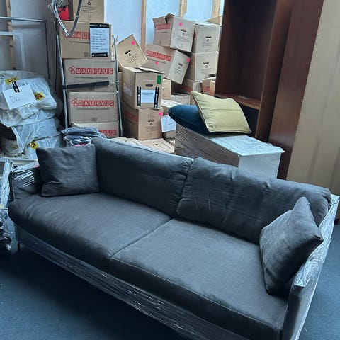 Använd soffa där men fortfarande jätteskön. Mulvadagrå i färgen med