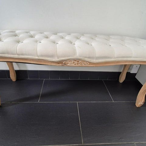 Nätt Sittbänk i fuskfårskinn. Ny stoppning och inte använd sedan renovering av tapetserare. Mått: 103 x 32 cm höjd på armstöd 53 cm.