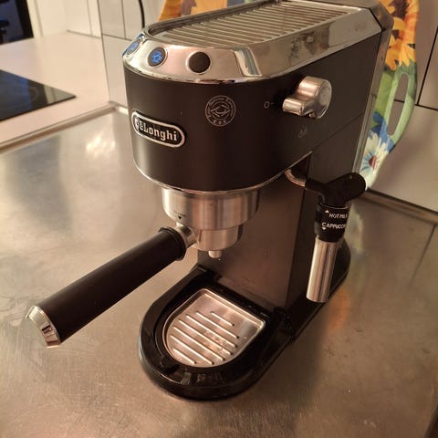 DeLonghi Dedica espressomaskin i vitt med kompakta mått. Utrustad med ångspinnare för mjölkskumning. Säljs då den sällan används.