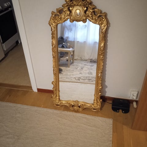 Spegel med gulram i måtten 75x55 cm. Hade den som hallspegel i vår sekelskifteslägenhet men passar ej nu i vårt hus.