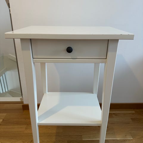 Äldre sängbord med låda i vitmålat trä.