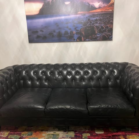 chesterfield 3 sits soffa. Det finns små märken från katt på några ställen från tidigare ägare men det syns inte mycket. Därav priset. Riktigt bra skick och helhetsintryck.