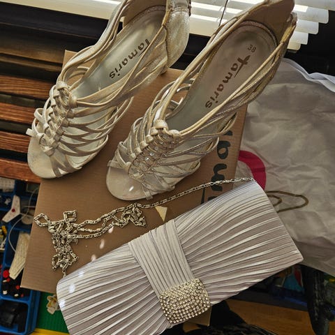 Tamaris finskor i storlek 39. Skorna har öppen tå och snörning framtill samt dragkedja baktill. Strass, guld i en rosa ton. Trots hög klack är de mycket bekväma att gå i.