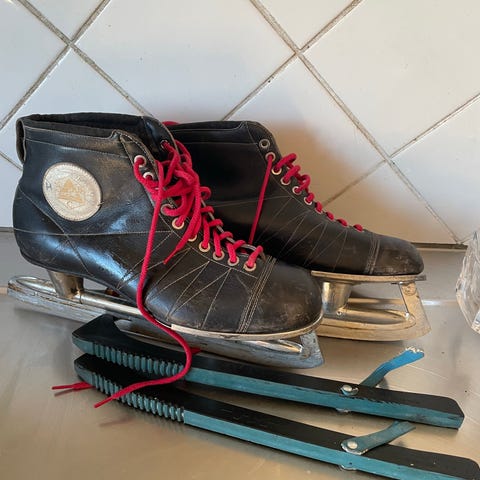 Säljer ett par äldre, klassiska skridskor med läderkänga och stålskenor. Gedigen konstruktion och tydlig patina som ger rätt vintagekänsla.