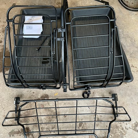 Volvo original, dubbla grindar med avskiljning samt lastgaller. Lås trasiga. Går att köpa nya på Volvo men efter att nycklarna gått av två gånger har jag i stället haft cykellås.