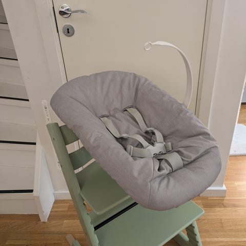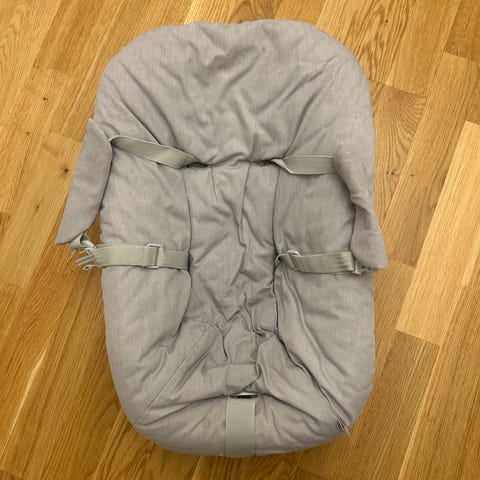 Tripp Trapp Newborn Set till barnstol i grå färg. Liggdelen är utformad för barn och har säkerhetsbälte för trygg användning. Den har två justerbara inställningar och bra benstöd så att barnet sitter tryggt och bekvämt.