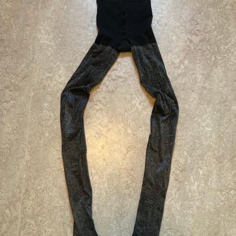 Svarta strumpbyxor med blommönster på, även de i svart färg till vuxen; dam i storlek 38/40 från Lindex. Förstärkta i grenen.