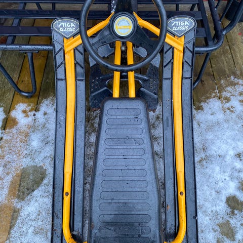 Stiga snowracer med svart och gul ram, utrustad med ratt och sadel.