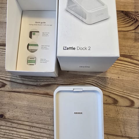 Zettle Dock 2 kortläsare i vit färg. En enhet för att hantera betalningar via kort, kompatibel med Zettle-systemet från PayPal.