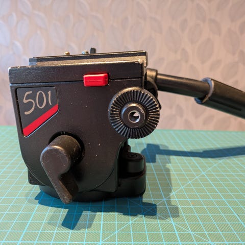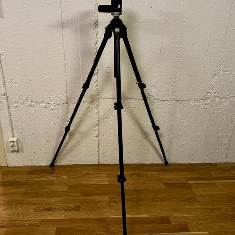 En Monopod i bra skick. En av gummifötterna har blivit utbytt och det följer med två stycken till om du behöver byta ut någon i framtiden. Armen till videohuvudet finns inte men jag har själv inte saknat denna. Det går lätt att byta till ett annat stativhuvud om man vill. Minsta höjd är 77cm och högsta höjd är 2m.