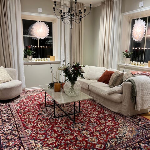 Mattan är i fint skick, utan fläckar eller skador. Ligger plant och har jämn lugg. Passar perfekt i vardagsrum, matsal eller större sällskapsrum.