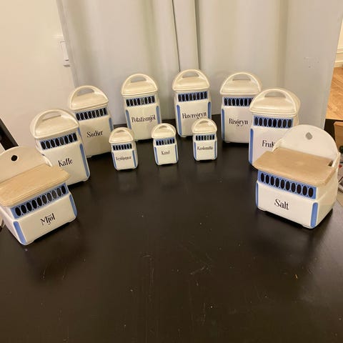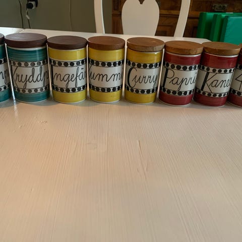 Set med 11 kryddburkar i porslin med lock. Varje burk har en dekorativ blommönster och är avsedda för förvaring av kryddor i köket. Nämnt pris eller högstbjudande ej under 250 kr.
