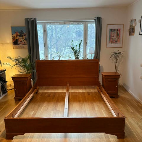 Säng med gavlar i körsbärsträd, madrass mått 190 cm x 133 cm. Demonterbar och två sängbord (flyttgods från USA). Finns ytterligare identisk säng (pris för båda 800 kr).