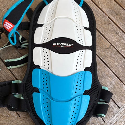 Mkt fint ryggskydd från Decathlon stl xs, Dottern är nu 156cm och då är den precis för liten. Skulle säga att hon hade den från hon var ca 140cm till då nu. Den är otroligt skön att ha på (jag har samma modell fast för dam) med praktiskt blixtlås och midjeband som håller den på plats