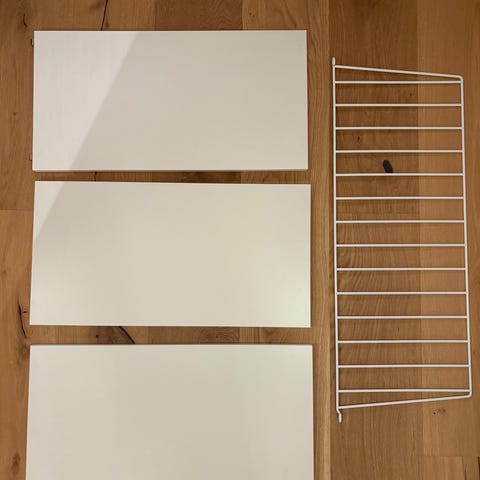 Söt förvaringshylla i matt rosa metall. Kan hängas upp eller lutas mot vägg.