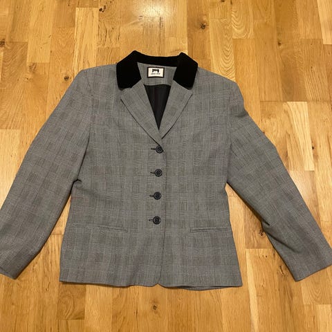 Kavaj till dam i storlek 38 i svart färg med vita streck. Två knappar framtill som går att knäppa och knäppa upp. Fuskfickor framtill. Dekorationsknappar på ärmarna. Något puffade över axlarna. Endast kemtvätt.