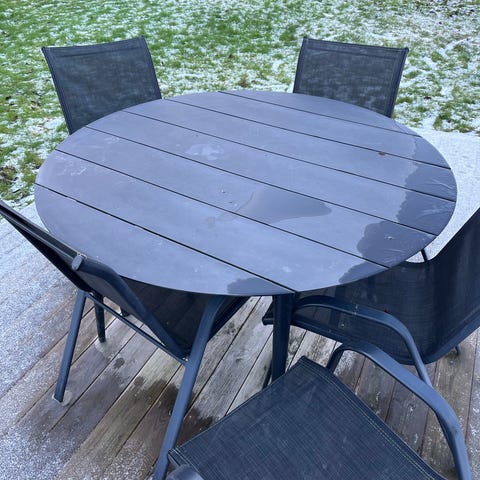 Trädgårdsmöbelset med runt bord och fyra stolar i metall och trä