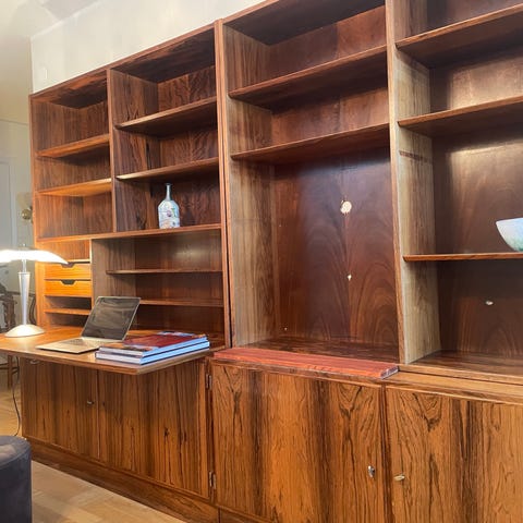 Klassisk 70- tals bokhylla med belysning i vitrindelen.